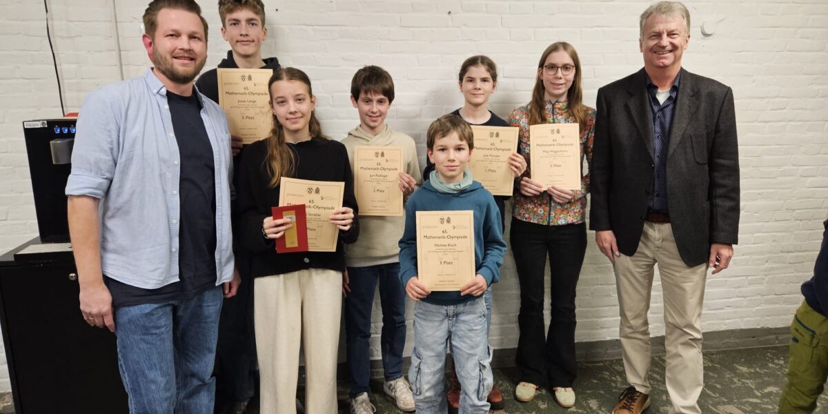 Am vergangenen Donnerstag fand die feierliche Siegerehrung der 65. Mathematik-Olympiade statt. Für die zweite Runde der Mathematik-Olympiade 2025, in der unsere Schülerinnen sehr anspruchsvolle und herausfordernde Aufgaben lösen mussten, hatten sich zahlreiche Talente des Pascal-Gymnasiums qualifiziert. Am Ende konnten sich sieben Schülerinnen unserer Schule über eine Platzierung unter den ersten drei Plätzen freuen und im Rahmen einer Feierstunde am Wilhelm-Hittorf-Gymnasium ihre wohlverdienten Preise und Urkunden entgegennehmen. Die Auszeichnungen wurden im Beisein von Schulleiter Ralf Brameier und Mathematiklehrer Lukas Grüner überreicht, die den Preisträgern persönlich gratulierten.