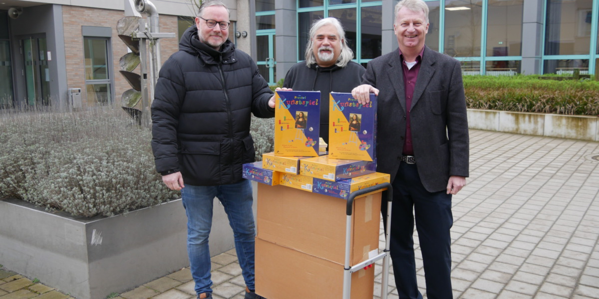 Es gibt auch wirklich schöne Überraschungen in dieser Zeit: Das Pascal-Gymnasium kann sich völlig unerwartet über ein großzügiges Geschenk freuen. Bernd Schulze-Dephoff (links im Bild) vom Sparkassenverband spendete unserer Schule in der letzten Woche über 20 Exemplare des Gesellschaftspiels „Das Kunstspiel“. Mit Schulleiter Ralf Brameier freut sich Kunstlehrer Ortwin Rombeck-Prinz darüber, dass die Pascalerinnen und Pascaler nun einen weiteren spielerischen Zugang zur Kunst haben – wir bedanken uns herzlich beim Sparkassenverband für diese großzügige Spende!