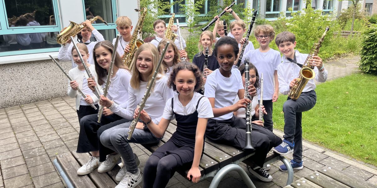 Auch beim Sommerkonzert 2025 war die Aula wieder voll be- und in eine wunderbare Atmosphäre versetzt. Die ca. 300 Musiker*innen von Klasse 5 bis Q2 zeigten beeindruckend ihr musikalisches Können. Die Bläsergruppen der fünften Klassen heizten zu Beginn mit dem „Power Rock“ den Saal ein. Ihr erstes Konzert zeigte bereits die großen Fortschritte, die die Jüngsten bei Ralph Kiepe und Claudia Mulcahy nach wenigen Monaten auf ihren Instrumenten erreicht haben.