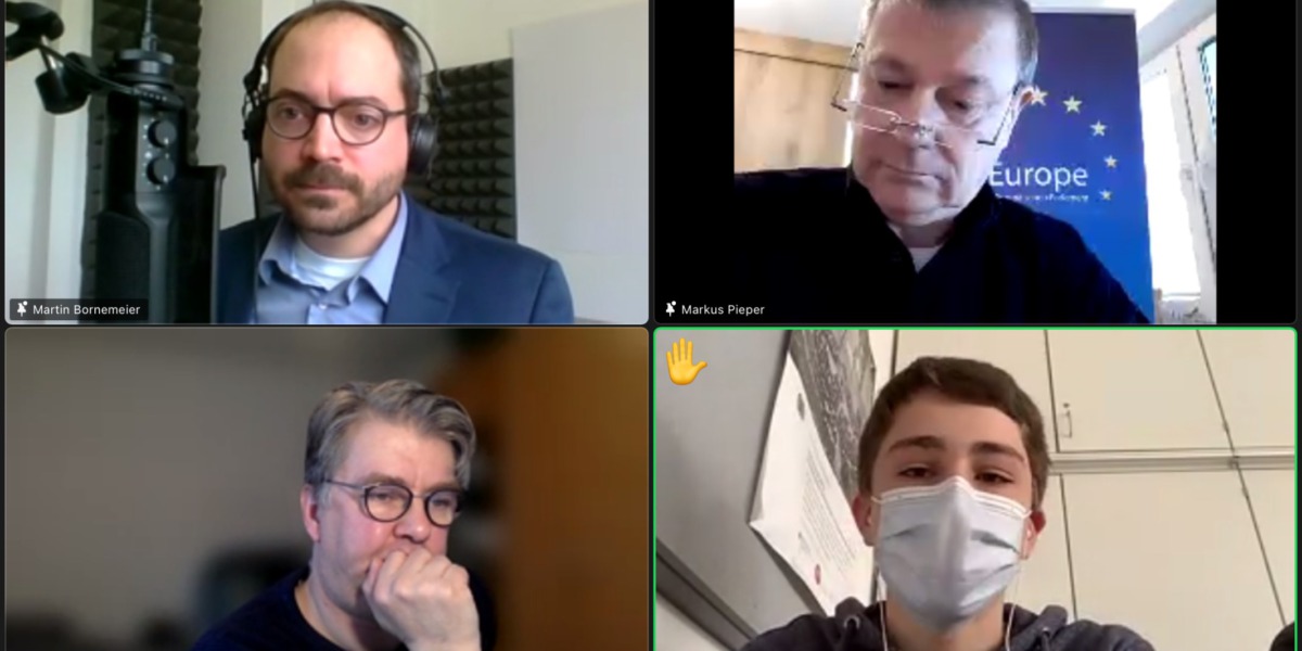 Eigentlich wäre die 9f in dieser Woche auf Klassenfahrt in Brüssel und würde dort die EU live erleben. Da dies coronabedingt nicht möglich ist, nahm sie am Freitag von ihrem Klassenraum aus, an einem von der Konrad-Adenauer-Stiftung organisierten digitalen „Europadialog“ mit Frank Burgdörfer, Experte im „Team Europe“ der Europäischen Kommission und Dr. Markus Pieper, langjähriges Mitglied (CDU) des Europäischen Parlaments, teil.
