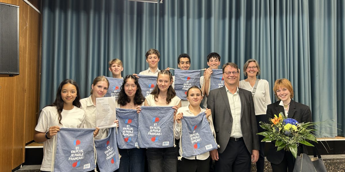 „Ist es euch egal, dass die Erde stirbt?“ Mit dieser provokanten Frage beginnt das Lied, das eine Gruppe von Schüler*innen der Klasse 8f auf Französisch geschrieben hat. Und mit diesem flammenden Appell für mehr Umweltbewusstsein hat die Gruppe jetzt einen Sonderpreis im Bundeswettbewerb Fremdsprachen gewonnen. Bei der Preisverleihung am 5. Juni 2024 in Detmold konnten die Schüler*innen ihr Lied live aufführen und ernteten viel Applaus dafür.