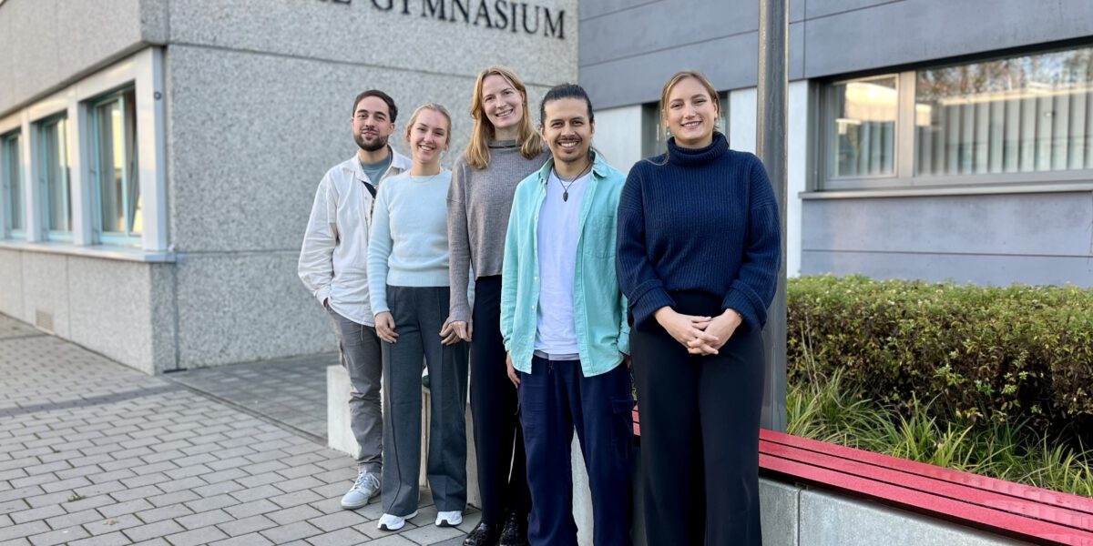 Der Herbst wird immer rauer, aber seit Anfang November weht auch ein frischer Wind der anderen Art durch das Pascal-Gymnasium: Fünf neue Lehramtsanwärter*innen haben haben ihren Dienst an unserer Schule angetreten. Wir freuen uns sehr, dass (von links nach rechts) Alberto Arévalo Ruiz (AZ) (Spanisch / Französisch), Wibke Borgmeier (BW) (Französisch / Erdkunde), Lisa Maihöfer (MR) (Mathematik / Sport), Daniel Pinzon Vargas (PV) (Spanisch, Philosophie) und Marlene Seeber (SE) (Deutsch / Biologie) nun bei uns sind. Ihnen und ihren Ausbildungsbeauftragen Dr. Anke Husmann und Ulrich Riepenhausen ein erlebnis- und erfolgreiches Referendariat!