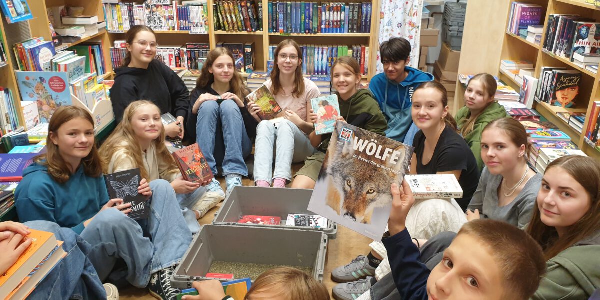 Das Büchereiteam der Pascal-Bücherei war wieder in der Buchhandlung „Schatzinsel“, um neuen Lesestoff zu besorgen. Das Team wählt dabei selbstständig Bücher aus, diskutiert gemeinsam, ob das Buch angeschafft werden soll, und entscheidet dann demokratisch. Eine große Hilfe bei der Auswahl ist auch Buchhändler Peter Seiler, der der Gruppe beratend zur Seite steht. Unser Dank gilt auch dem Förderverein, der durch seine Spenden einen großen Teil der Bücher mitfinanziert.
