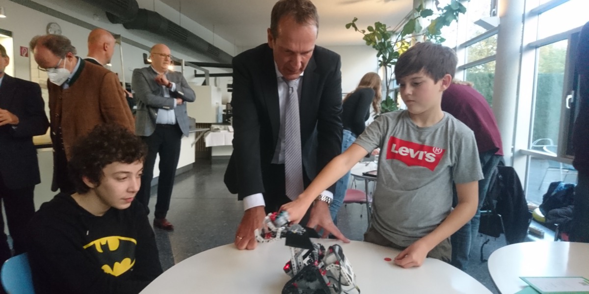 Fünf Schüler der Klassen 6 und 7 haben am letzten Montag technisch-informatische Projekte auf der Jahresmitgliederversammlung des VDI Münsterländer Bezirksverein im Technologiehof Münster präsentiert. Noah Partzsch, Jonathan Burchard und Jan Schmidt haben zwei Projekte vorgestellt, die sie mit der SenseBox im Rahmen des Projekts GI@School entwickelt haben. Die SenseBox ist ein Mini-Controller, der über bestimmte Sensoren verfügt bzw. mit externen Sensoren verbunden werden kann, und z. B. Umweltdaten misst. So kann z. B. eine Lautstärkeampel oder eine CO2-Ampel gebaut werden. Das dritte Projekt entstand in der Lego-Roboter-AG: Alex Mitkov und Alexander Heinzelmann haben einen “bissigen” Lego-Roboter präsentiert mit Raubtiergebiss, welches zuschnappt, wenn die Hand ins “Maul” gehalten wird.