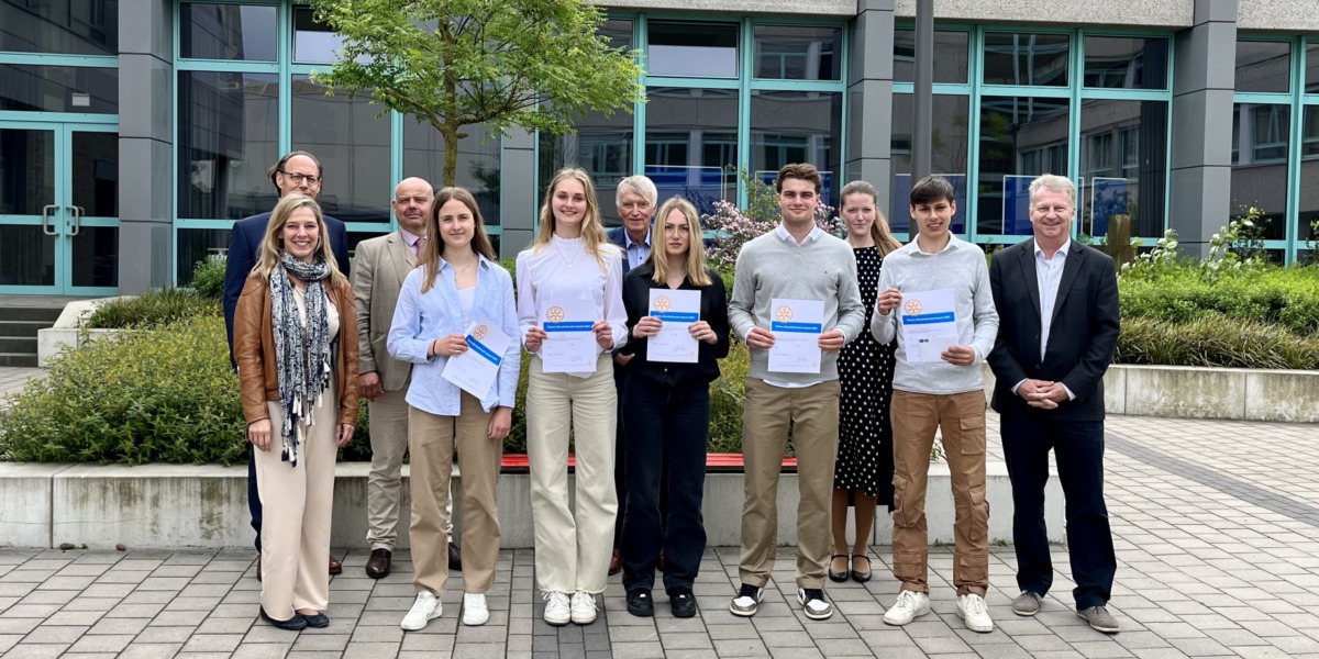 “Es ist beeindruckend, wie deutlich und überzeugend Ihr in diesem Einzelwettbewerb als Team aufgetreten seid.” Mit diesen Worten von Rotary-Juror Dr. Karl-Heinrich Sümmermann begann die Siegerehrung des diesjährigen Rotary Berufsdienste-Awards, der am 23. Mai in der Aula unserer Schule stattfand. Das angesprochene “Team” bestand aus fünf Schüler*innen der Q1, die sich der Herausforderung gestellt hatten, ihre Facharbeitsthemen des 3. Quartals in mitreißende Vorträge umzugestalten und der Jahrgangsstufe EF in jeweils 15 Minuten vorzustellen – keine leichte Aufgabe, werden Referate doch ansonsten im vertrauten Klassenzimmer in eher kleinem Kreis und nicht auf der großen Aulabühne vor über 100 Zuhörer*innen gehalten. Die EF und die Jury, bestehend aus den Rotariern Prof. Dr. Carsten Feldmann (Fachhochschule Münster), Johann Friedrich Knubel (Geschäftsführer und Inhaber der Firmengruppe Knubel) und Dr. Karl-Heinz Sümmermann (ehem. Vorstandsmitglied der Agravis Raiffeisen AG) sowie der stellvertretenden Oberstufenkoordinatorin Eva-Christina Eßer und Schulleiter Ralf Brameier, konnten sich zusammen mit Organisatorin und Betreuerin Kathrein Vahrenhold über ein abwechslungsreiches Programm freuen: