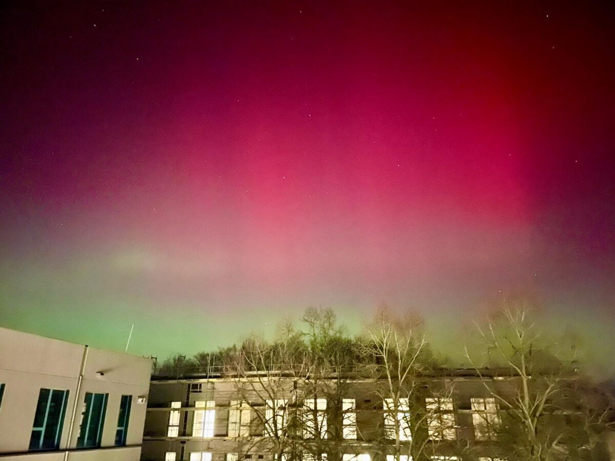 Daniel Schulz, Mathematik- und Physiklehrer am Pascal-Gymnasium, hat sich die Gelegenheit nicht entgehen lassen und über Alt- und Neubau grüne und rote Polarlichter eingefangen.