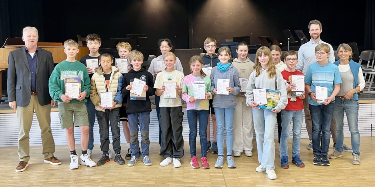 Weitere 13 Schüler*innen aus den Stufen 5 bis 9 konnten Urkunden und Sachpreise für 2. und 3. Plätze von Schulleiter Ralf Brameier in Empfang nehmen, darunter auch Johann Donath aus der 6f mit dem „größten Kängurusprung“, der größten Anzahl nacheinander richtig gelöster Aufgaben, und Chaojie Zhang aus der 5e4, der erst seit einigen Monaten in Deutschland lebt und die Aufgaben auf Mandarin bearbeitet hatte. „Die vielen Spiele und Bücher verkürzen sicherlich die Fahrt im Bus nach Paris“, war sich Raöf Brameier mit Blick auf die Jubiläums-Fahrt “Pascal à Paris” sicher – und sie helfen sicher auch beim Überbrücken der Zeit zum „K-Day“ 2025, wenn wieder mathematisch um die Wette gehüpft werden wird.