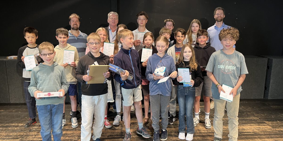 Im „Mathe-Wetthüpfen“ übten sich dieses Jahr rund 300 Pascaler*innen beim Känguru-Wettbewerb. Sie hatten auf Deutsch, Französisch, Englisch und Mandarin geknobelt. Nun fand die Siegerehrung in der Aula statt, in der sich alle Teilnehmer*innen versammelten. „Euch allen kann man gratulieren“, betonte Herr Brameier, „da ihr euch alle diesem Wettbewerb gestellt habt.“ Die Stimmung war großartig, alle Preisträger*innen durften auf die Bühne und wurden von ihren Mitschüler*innen gefeiert. Eine rekordverdächtige Anzahl an 19 Preisen wurde vom Schulleiter überreicht. Ein 1. Platz wurde dabei zweimal vergeben, einmal an Temmo Meyer-Àcs aus der 5f sowie an Jule Förster aus der 6f. Jule kann dabei besonders stolz sein: Sie erreichte bei dem Wettbewerb die volle Punktzahl (120 Punkte), was schon seit vielen Jahren am Pascal nicht mehr vorgekommen ist. Neben einem Sachpreis gab es für sie ein T-Shirt und eine goldene Ehrenurkunde.