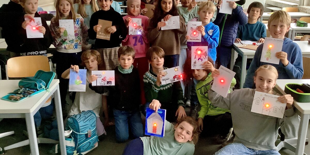 Passend zur Adventszeit haben sich in diesem Jahr der MINT-Baustein und der Baustein Kreatives Gestalten zusammen getan, um gemeinsam ein kleines, weihnachtliches Projekt zu erarbeiten. Dabei sind sehr individuelle und wunderschöne Weihnachtskarten inklusive LED-Leuchttechnik entstanden! Erst wurde entworfen, gezeichnet, gemalt und verziert und dann ging es an den Technikteil: Ein Stromkreislauf aus leitfähigem Klebeband musste mitsamt Batterie, LED-Birnchen und Einschaltautomatik in Form eines “Drück-mich-Knopfes” geschaffen werden. Das Ergebnis strahlt und leuchtet! Frohe Weihnachten an alle fleißigen Bastler- und Tüftler*innen!