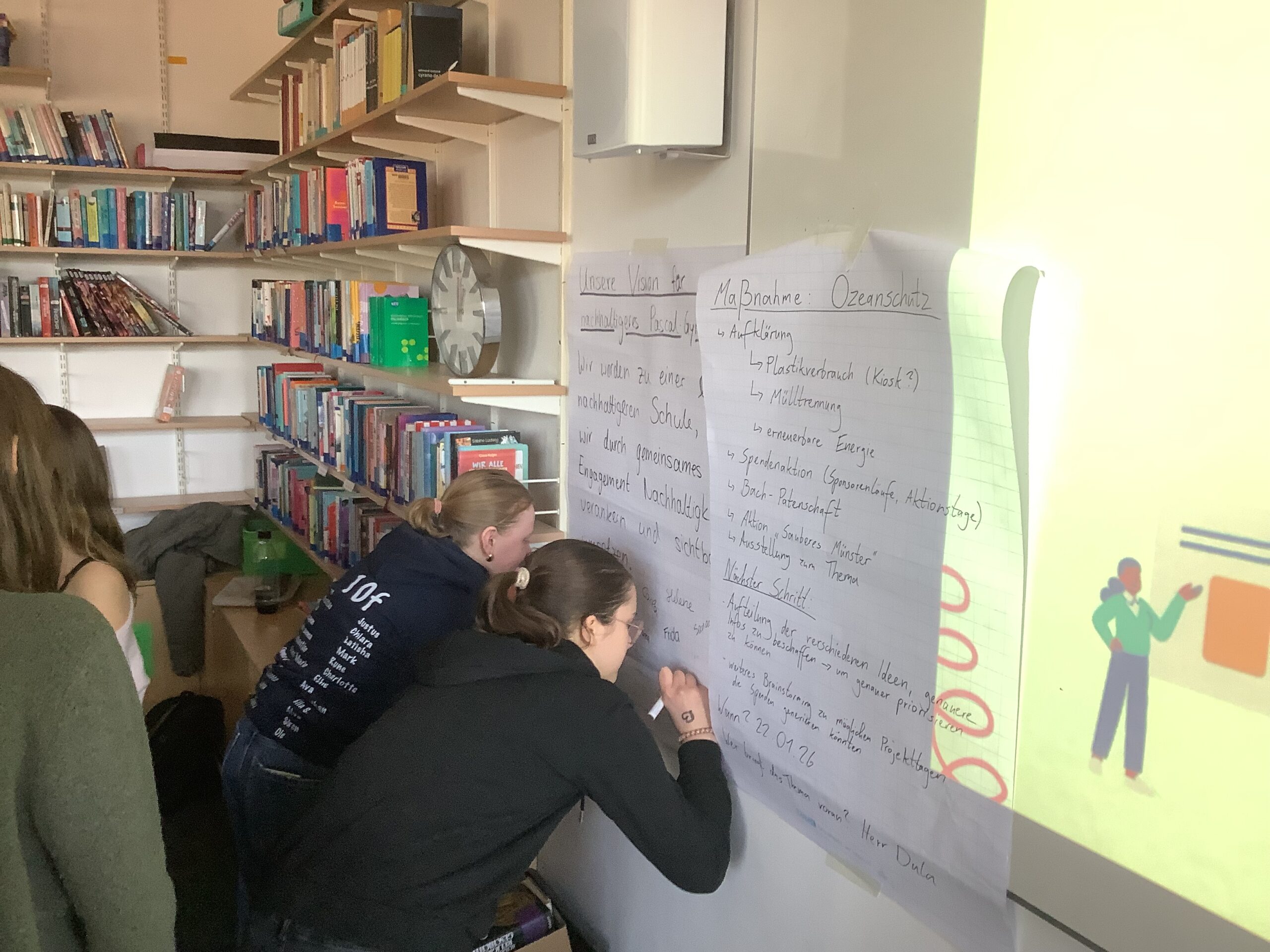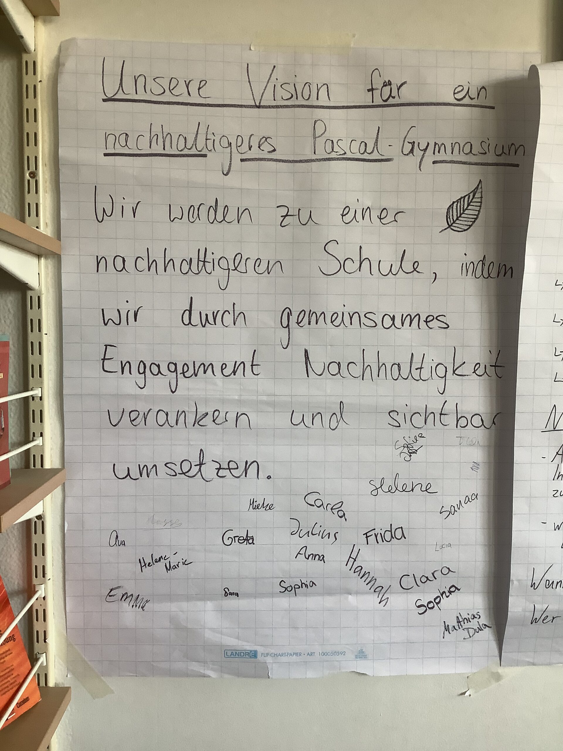 Anschließend einigte man sich im Rahmen des Workshops auf eine gemeinsame Vision für das Pascal: „Wir werden zu einer nachhaltigeren Schule, indem wir durch gemeinsames Engagement Nachhaltigkeit verankern und sichtbar umsetzen.“ Sie soll der Schule künftig als Leitlinie dienen und als verbindlicher Orientierungspunkt für weiteres nachhaltiges Handeln verstanden werden. Mit Unterschriften aller Teilnehmer wurde dieser Leitsatz besiegelt.