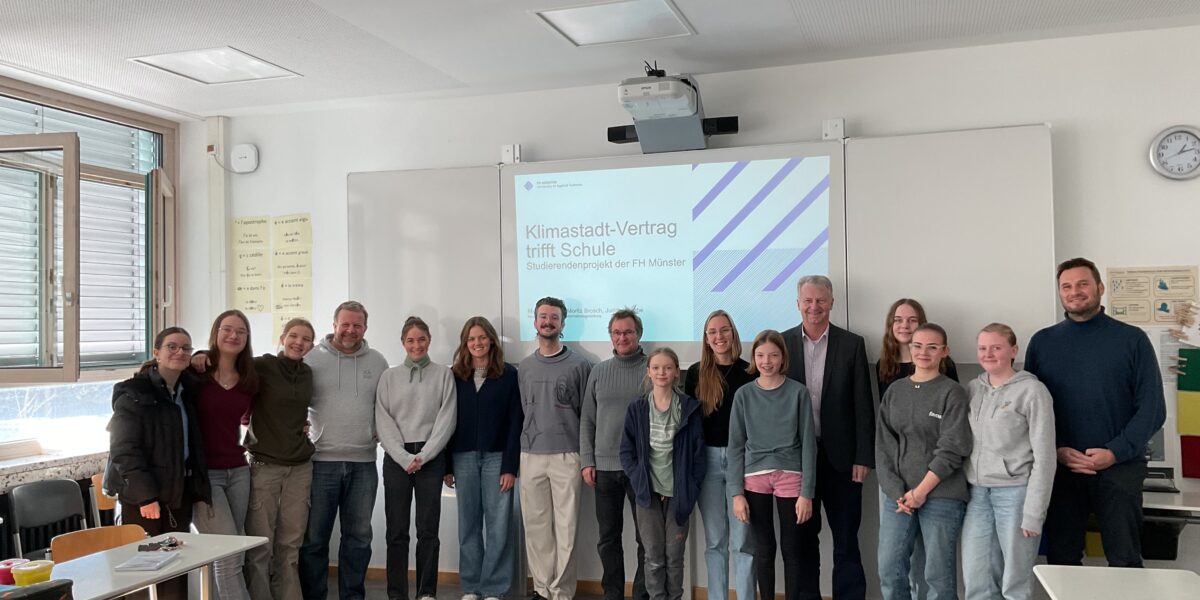 Wie kann Schule aktiv zum Klimastadtvertrag der Stadt Münster beitragen? Mit dieser Leitfrage fand an unserer Schule kürzlich der Workshop „Klimastadt-Vertrag trifft Schule“ statt. Das Pilotprojekt wurde in Kooperation mit der FH Münster im Rahmen der EU-Mission „100 Climate-Neutral and Smart Cities by 2030“ durchgeführt. Münster wurde von der Europäischen Union gemeinsam mit 99 weiteren Städten als Vorreiterstadt für die Mission ausgewählt.