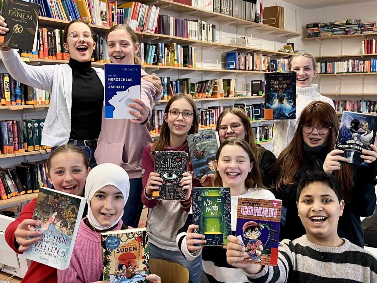 Schüler*innen von der Jahrgangsstufe 5 bis zur Q2 engagieren sich im Bücherei-Team und machen es möglich, dass man in jeder zweiten Pause Bücher ausleihen oder auch einfach nur im Forum Deutsch sitzen und lesen kann. Die Mitglieder des Teams leihen Bücher aus, buchen sie zurück, beraten bei Fragen, kaufen einmal im Jahr gemeinsam neue Bücher und stellen sie vor, räumen die Regale auf und sind meist selbst begeisterte Leser*innen, die ihre Leselust und konkrete Buchtipps gerne weitergeben.
